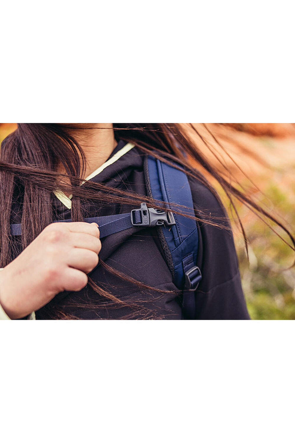 - Perforated, breathable shoulder harness with sternum strap featuring an integrated safety whistle