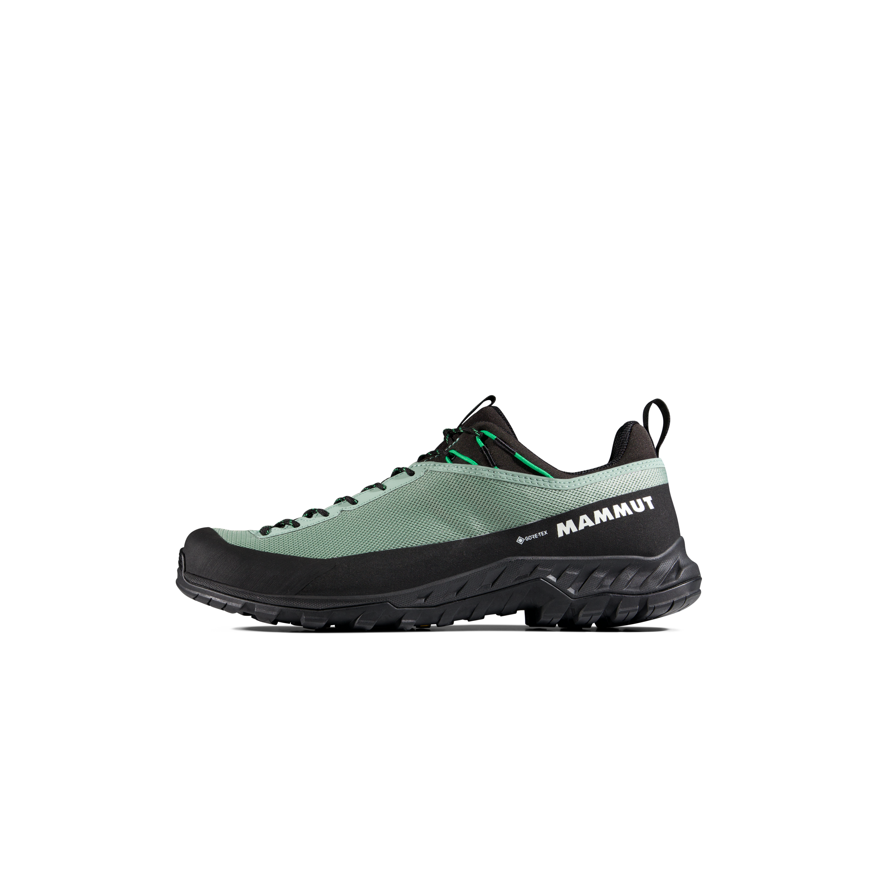 The Vibram® XS Trek outsole with Traction Lug™ is built for a high level of grip, and in the product benefits section Mammut also highlights a climbing zone for dependable traction and durability on unpredictable terrain. Additional protection comes from the rubber toe cap and raised rubber rand, which improve durability and help shield the shoe on rocky and abrasive surfaces.