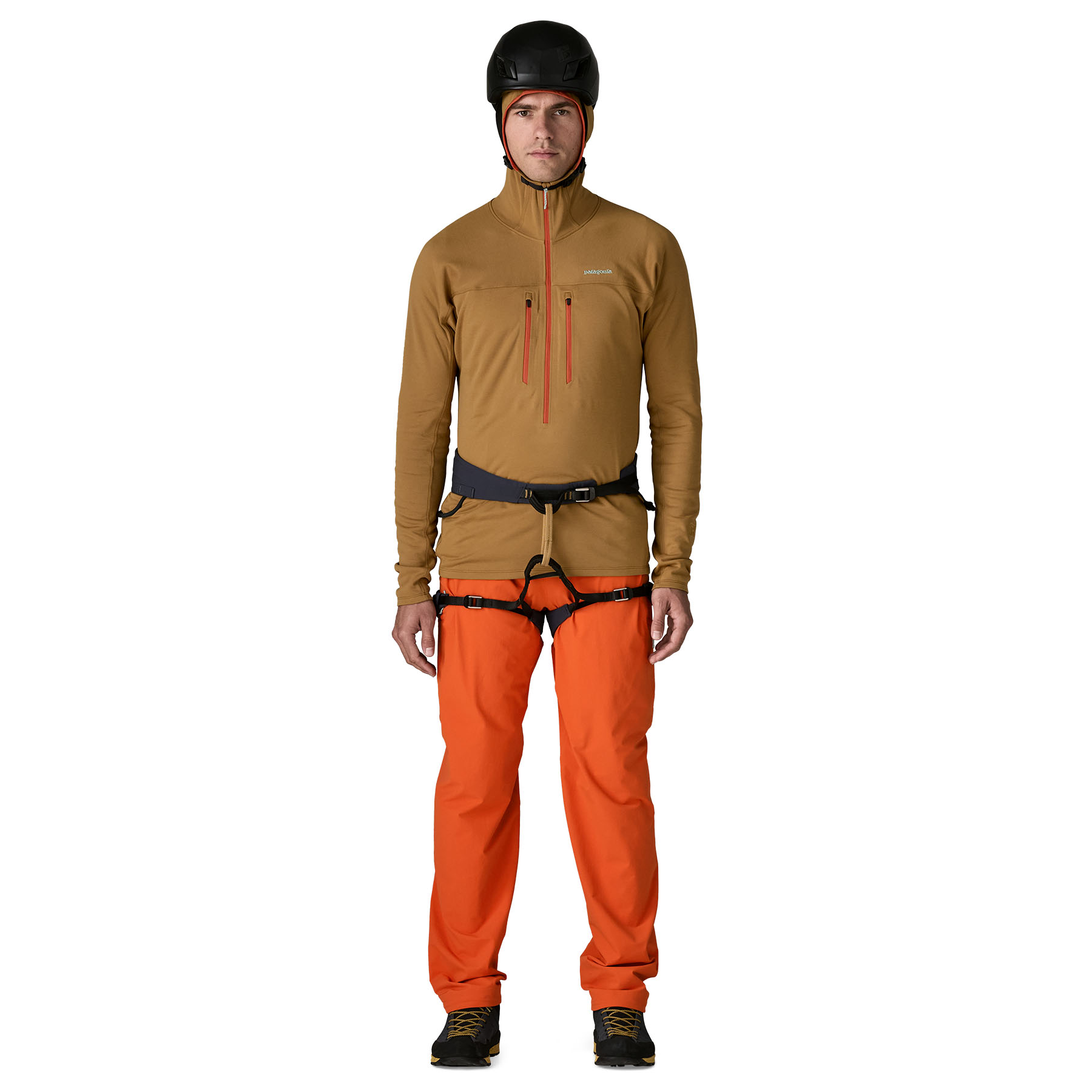 Weather-resistant, durable 92% recycled nylon/8% spandex double weave with a durable water repellent (DWR) finish made without intentionally added PFAS and a brushed interior for comfort - Built for All-Day Comfort in a Harness