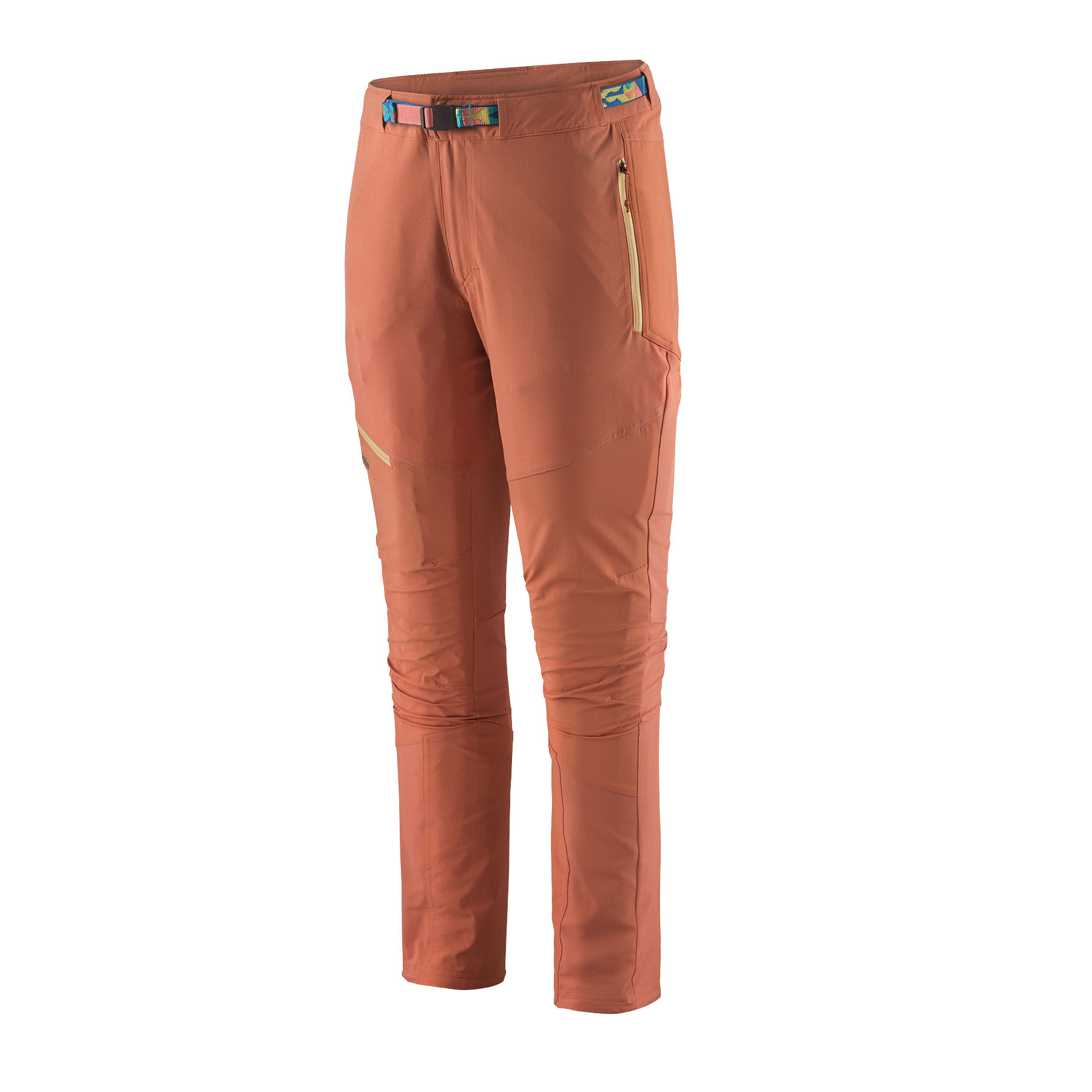 Low-profile waistband with separating zip fly and integrated adjustable belt ensures precise fit and stays comfortable under a harness or a backpack waistbelt
