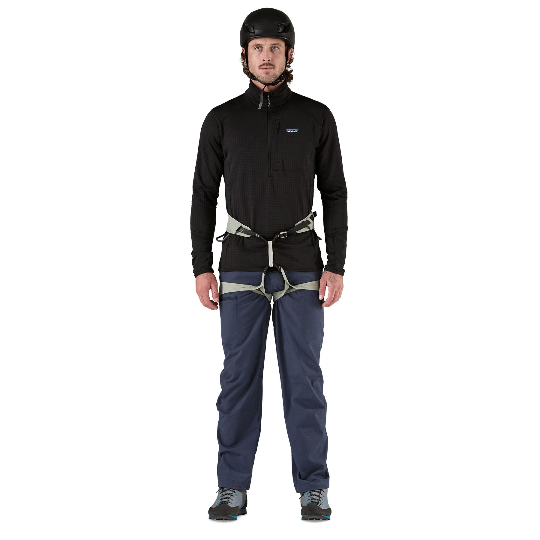 Zip fly with belt loops and partially elasticated waistband create a low-bulk, comfortable fit under a harness